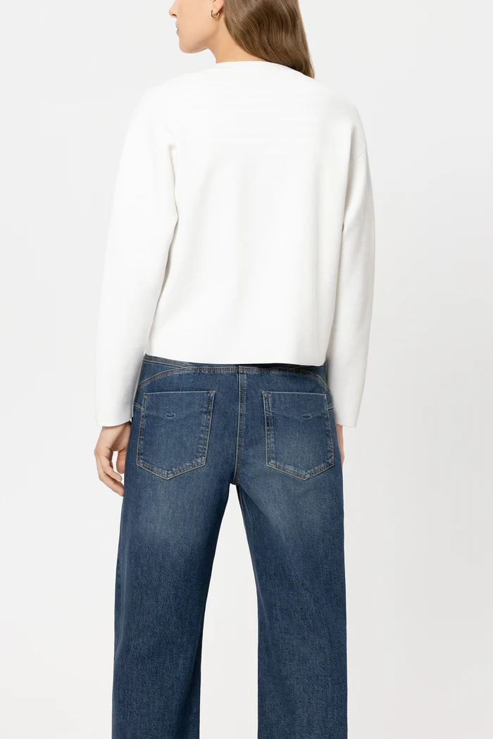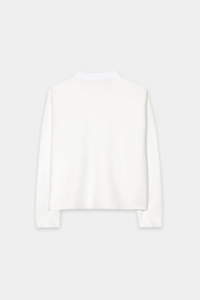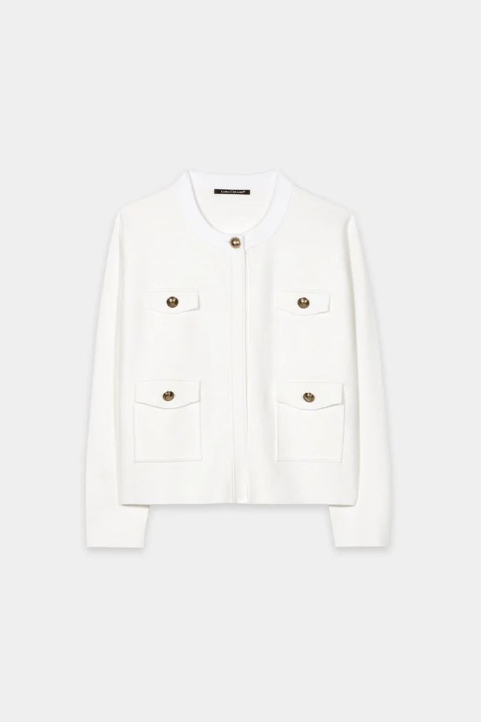 Sweter wykonany z elastycznej cienkiej dzianiny z certyfikowaną wiskozą Lenzing™ EcoVero™ i metalowymi ozdobnymi guzikami. Zapinana jest na guzik przy dekolcie i ma dwie naszywane kieszenie z przodu oraz dwie wskazane kieszenie na piersi.