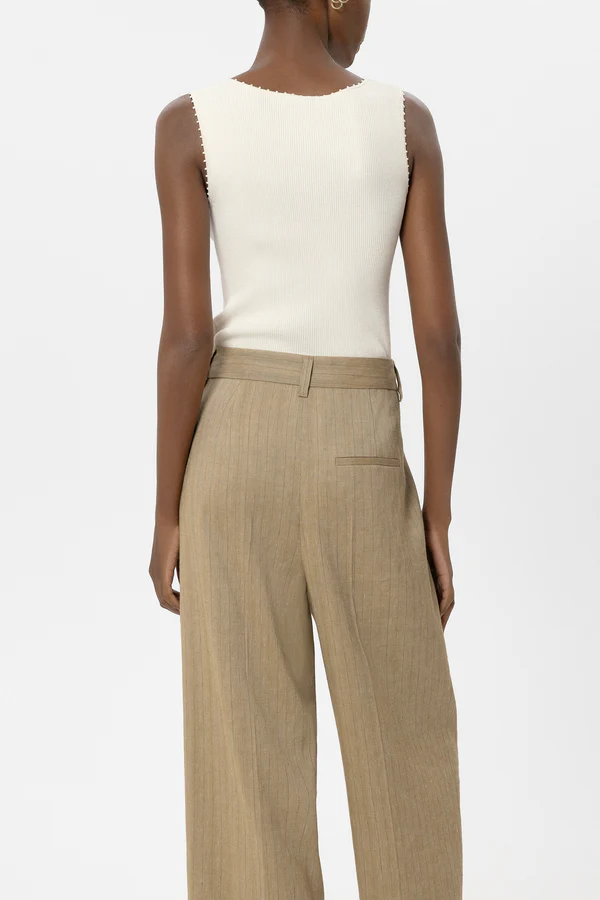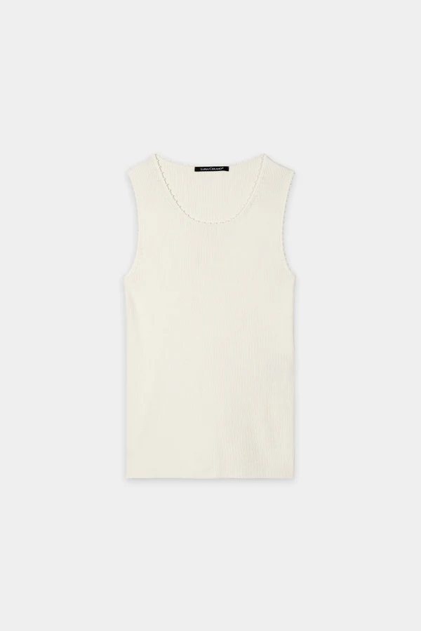 Top z miękkiej dzianiny wiskozowej o lekko krepowym splocie. Top na ramiączkach jest wykończony delikatnym pikotem przy okrągłym dekolcie i otworach na ręce.