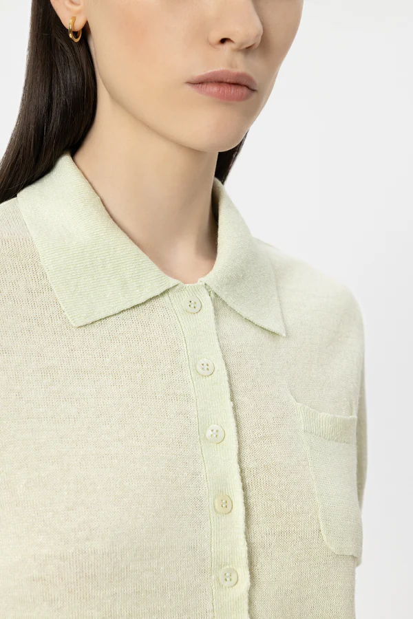 Koszulka polo wykonana z drobno dzianej włoskiej przędzy lnianej o chłodnym letnim dotyku i lekkim połysku. Charakteryzuje się kołnierzykiem polo z półdługą listwą guzikową i naszywaną kieszenią na piersi.