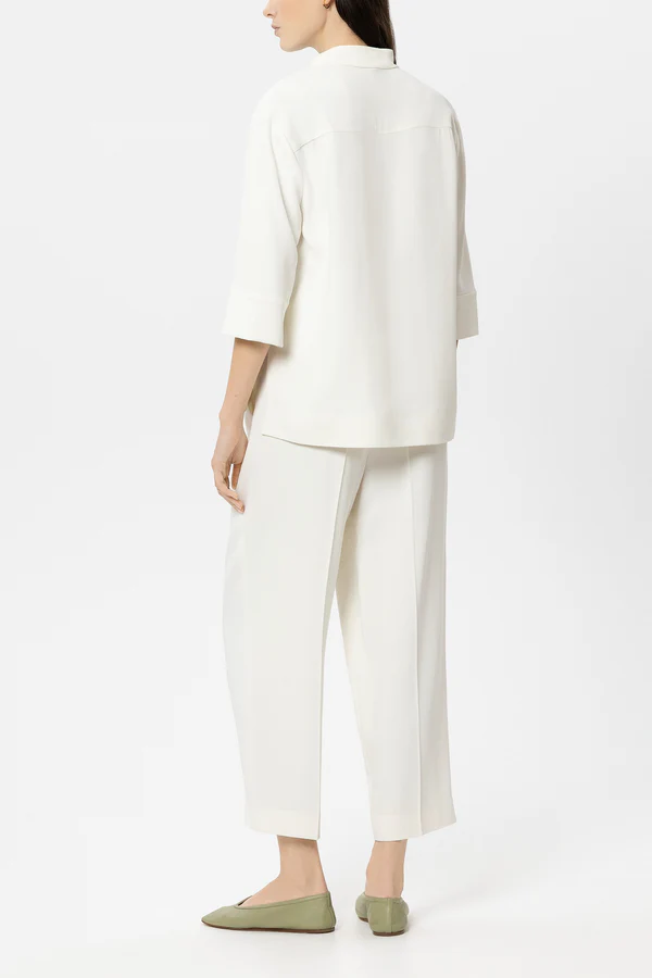 Luźne spodnie z lejącego materiału o zwężanym kroju i lekko przyciętym fasonie. Plisy z przodu dopełniają całości.