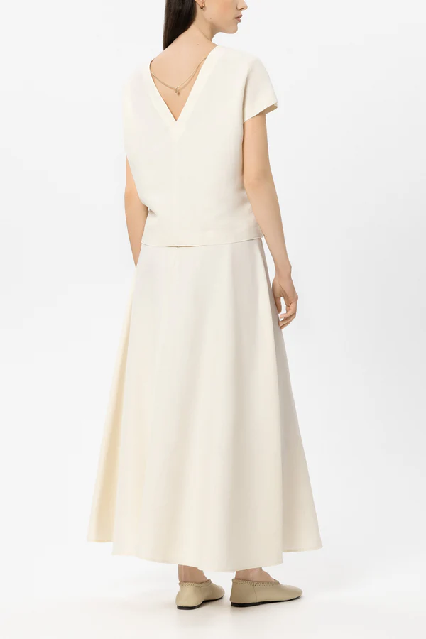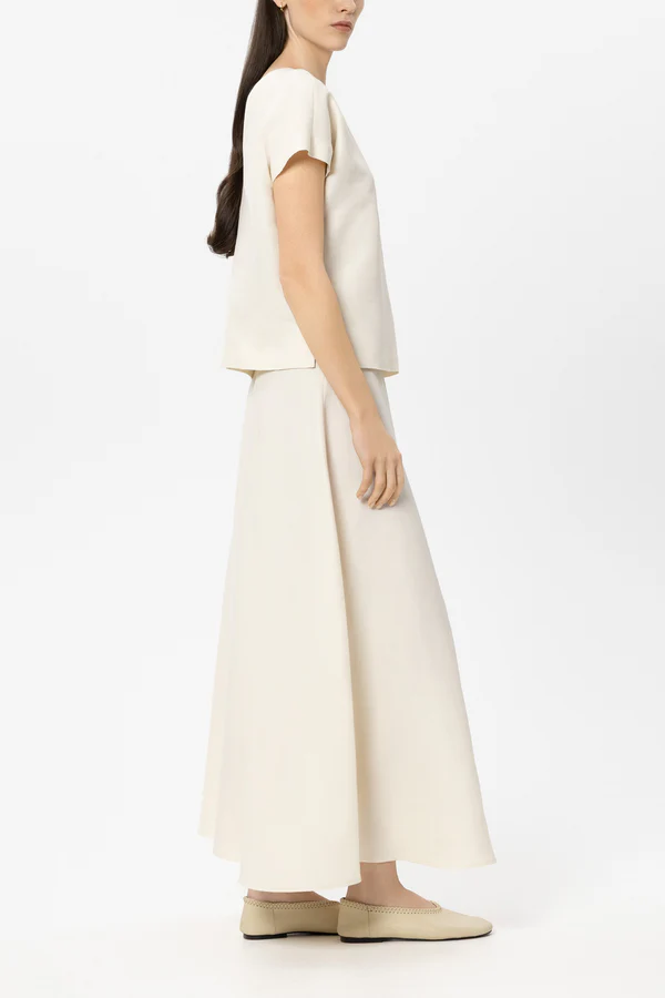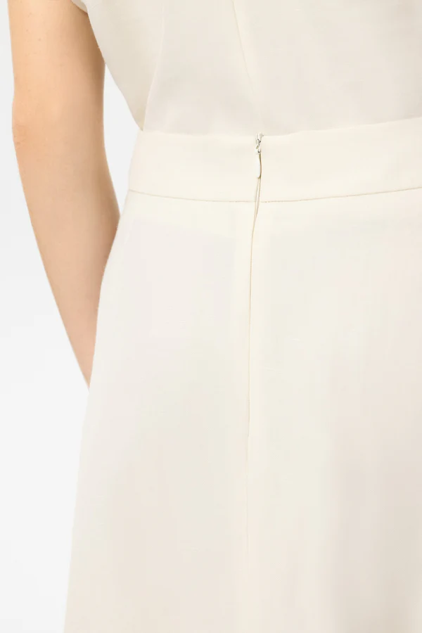 Długa, rozkloszowana spódnica wykonana z wysokiej jakości mieszanki lnu z subtelnym połyskiem. Z tyłu znajduje się ukryty zamek błyskawiczny.