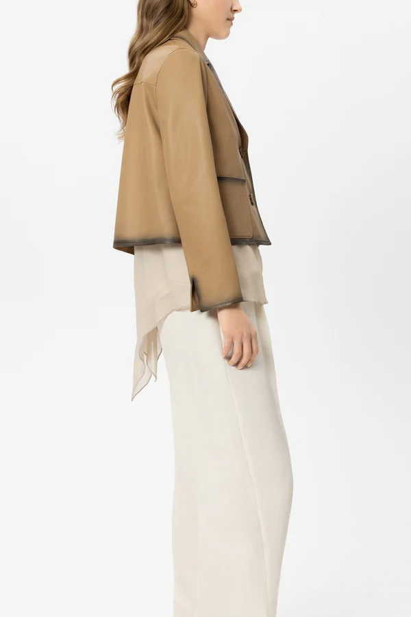 Krótka marynarka o prostym kroju wykonana z miękkiej jagnięcej skóry nappa z ręcznie barwionymi krawędziami w stylu vintage. Kołnierz klapowy i naszywane kieszenie dopełniają całości.