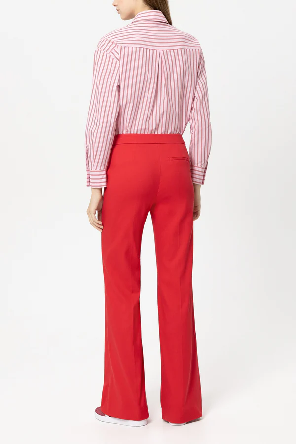 Rozkloszowane spodnie wykonane z elastycznej bawełnianej gabardyny. Spodnie mają ozdobne guziki na bocznych kieszeniach i wskazaną tylną kieszeń.