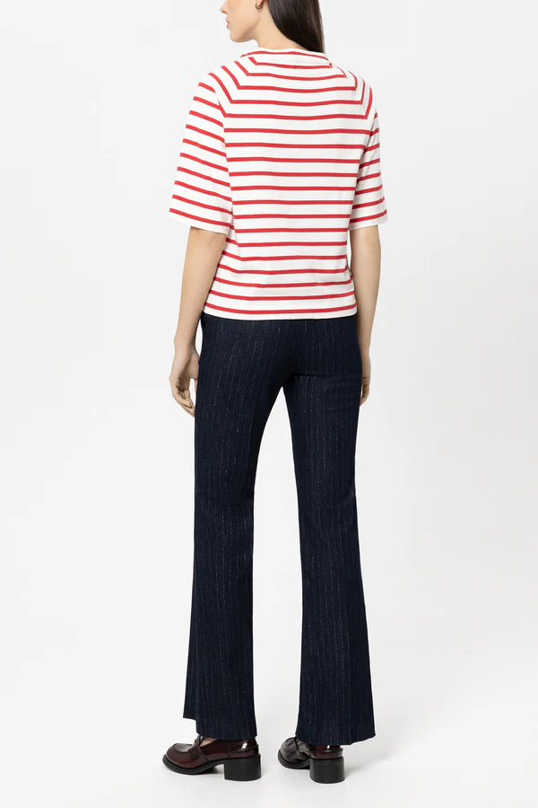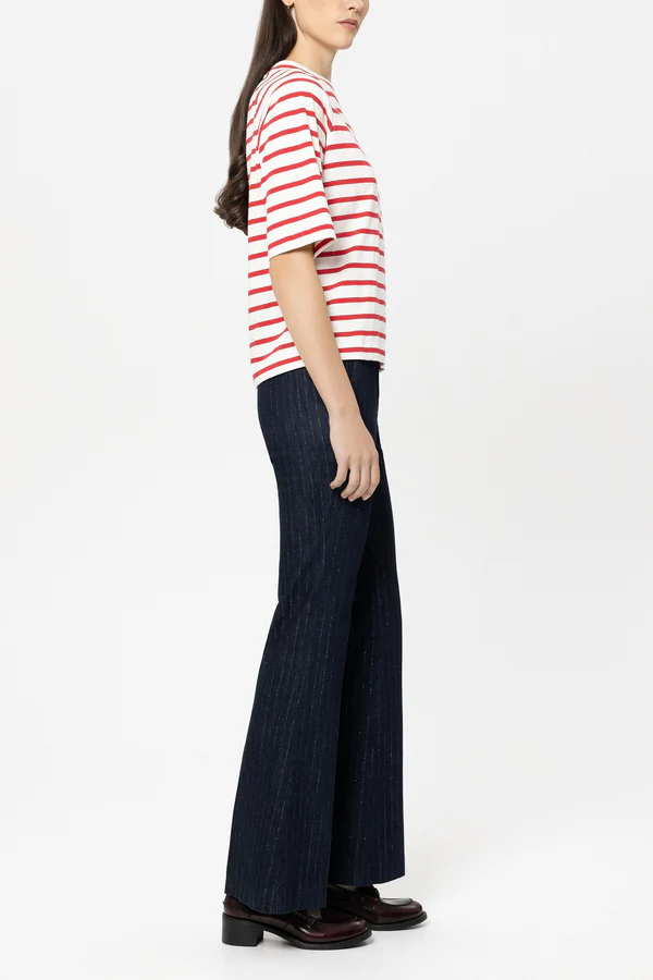 Dżinsy Bootleg w kolorze rinse wash z błyszczącymi prążkami. Dwie otwarte kieszenie boczne i dwie fałszywe kieszenie z tyłu dopełniają całości.