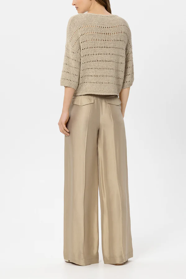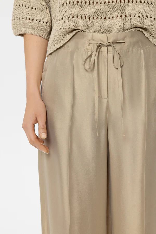 Szerokie spodnie do joggingu wykonane z elegancko opalizującej mieszanki wiskozy i jedwabiu z marszczeniami, dwiema rozciętymi kieszeniami i dwiema fałszywymi kieszeniami z klapkami. Pas można regulować za pomocą sznurka.