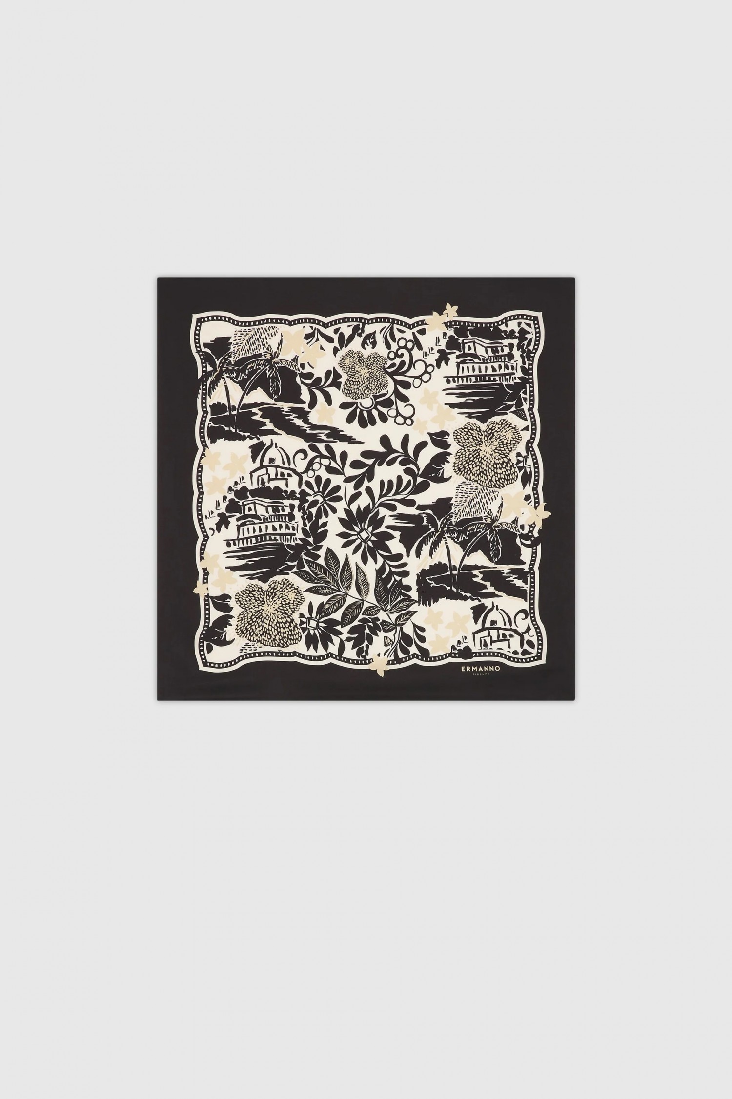 Kwadratowy szal z wiskozy satyny z tropikalnym nadrukiem i gładką ramą. Logo nadrukowane z jednej strony.