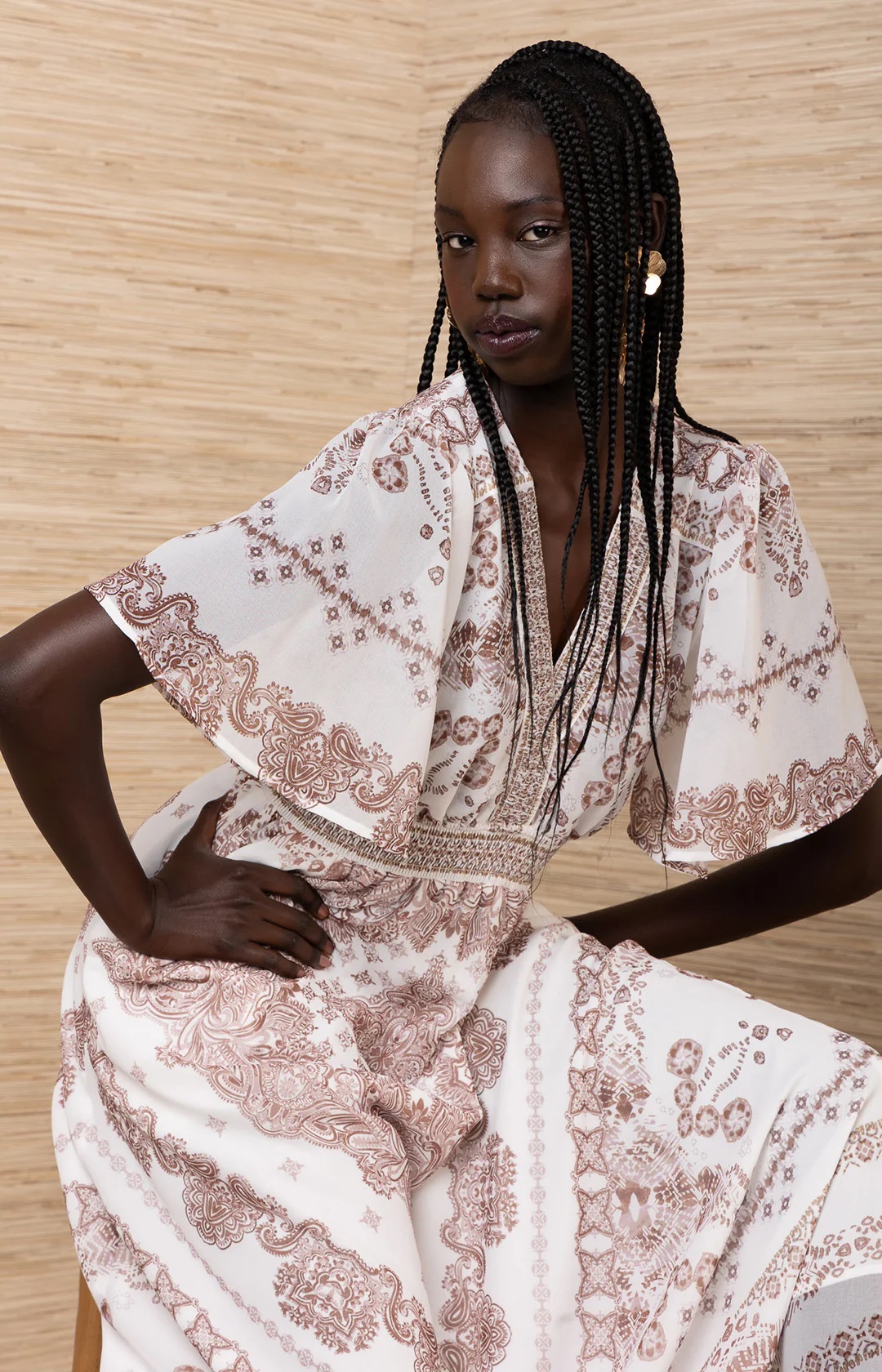 Ta niezwykle kobieca i twarzowa sukienka maxi prezentuje misterny batikowy print, który nadaje jej odważny, a zarazem ponadczasowy wygląd. Delikatnie marszczona talia podkreśla figurę, zapewniając jednocześnie wygodę i elastyczność, a dekolt w serek i bufiaste rękawy uzupełniają luźny krój. Ta luźna spódnica maxi wykończona jest precyzyjnymi lamówkami, które dodają jej swobody i objętości. Elegancka, uniwersalna i wygodna w noszeniu od rana do wieczora.