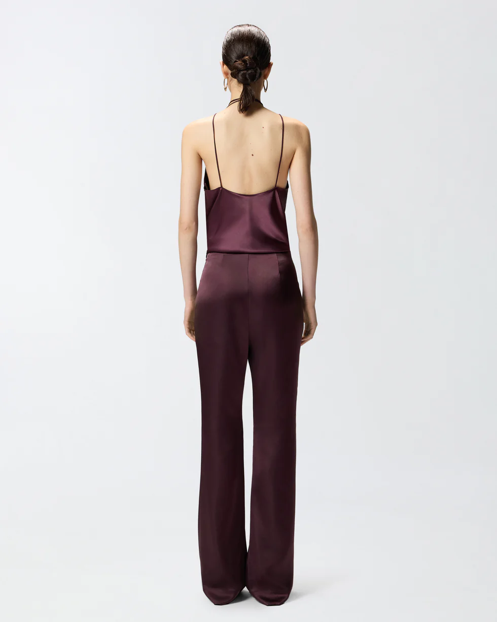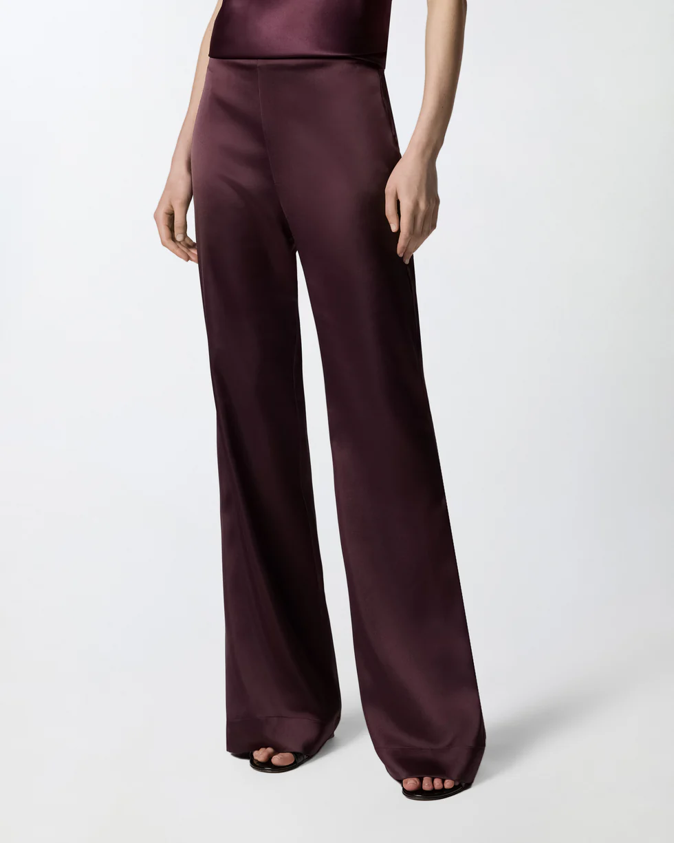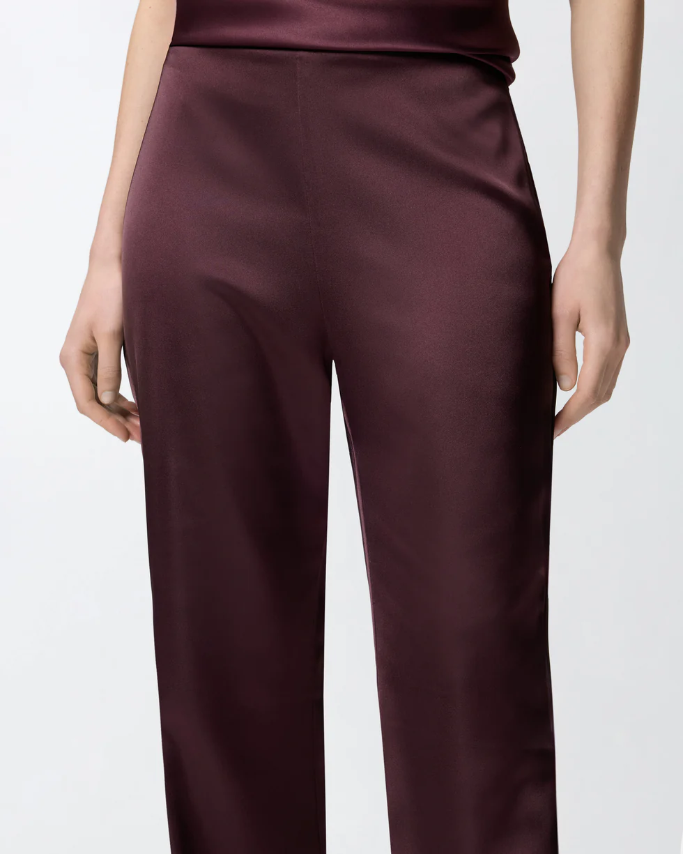Spodnie uszyte z elastycznej satyny o wyjątkowym błyszczącym i jedwabistym efekcie, łączącej komfort i wyrafinowanie. Rozkloszowana linia podkreśla sylwetkę, a boczny zamek błyskawiczny dyskretnie komponuje się z całością, zachowując czysty i minimalistyczny wygląd. Uniwersalny model, idealny do formalnych stylizacji, na eleganckie wieczory lub jako zdecydowany i efektowny akcent uszlachetniający casualową stylizację.